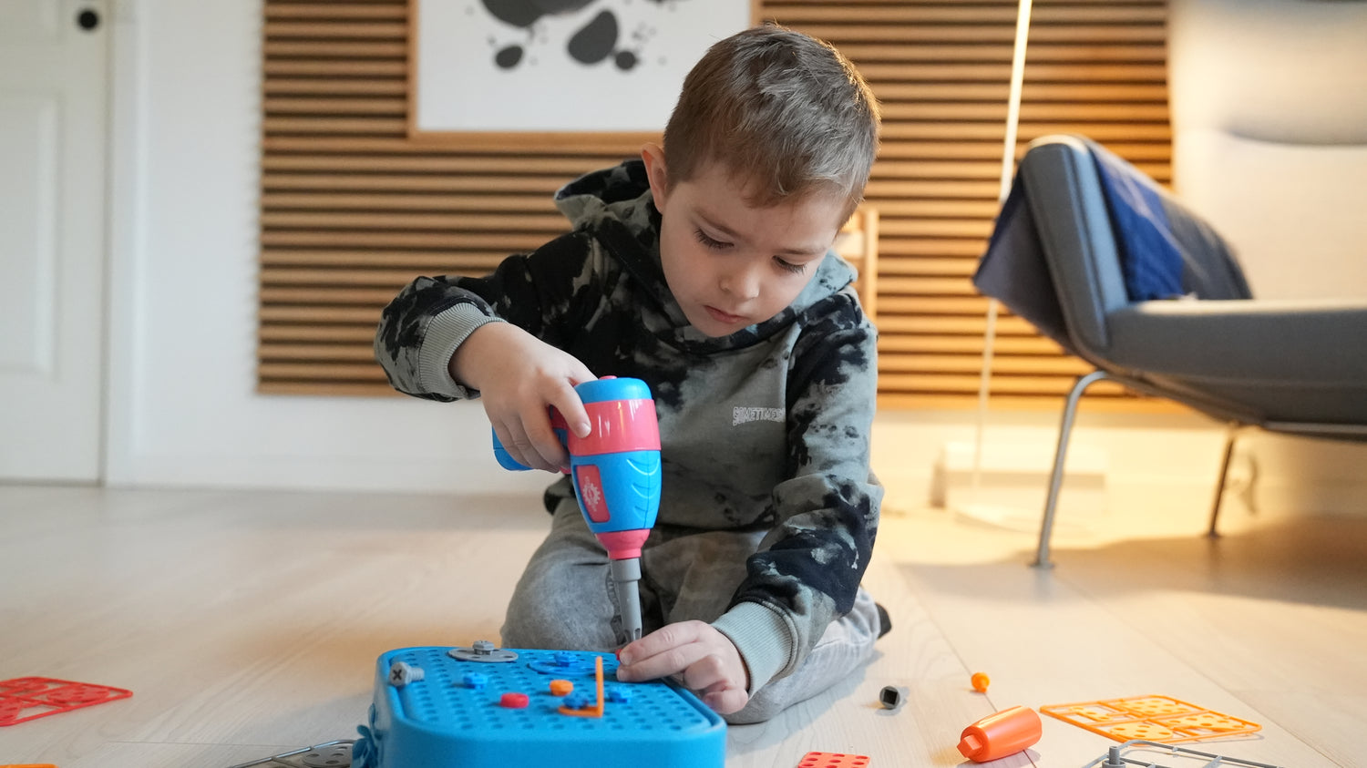 Nej, skruemaskinen larmer ikke som en rigtig boremaskine. Den er designet specielt til børn og laver kun en mild, børnevenlig lyd, så legen føles realistisk - uden at være generende for hverken børn eller voksne i hjemmet