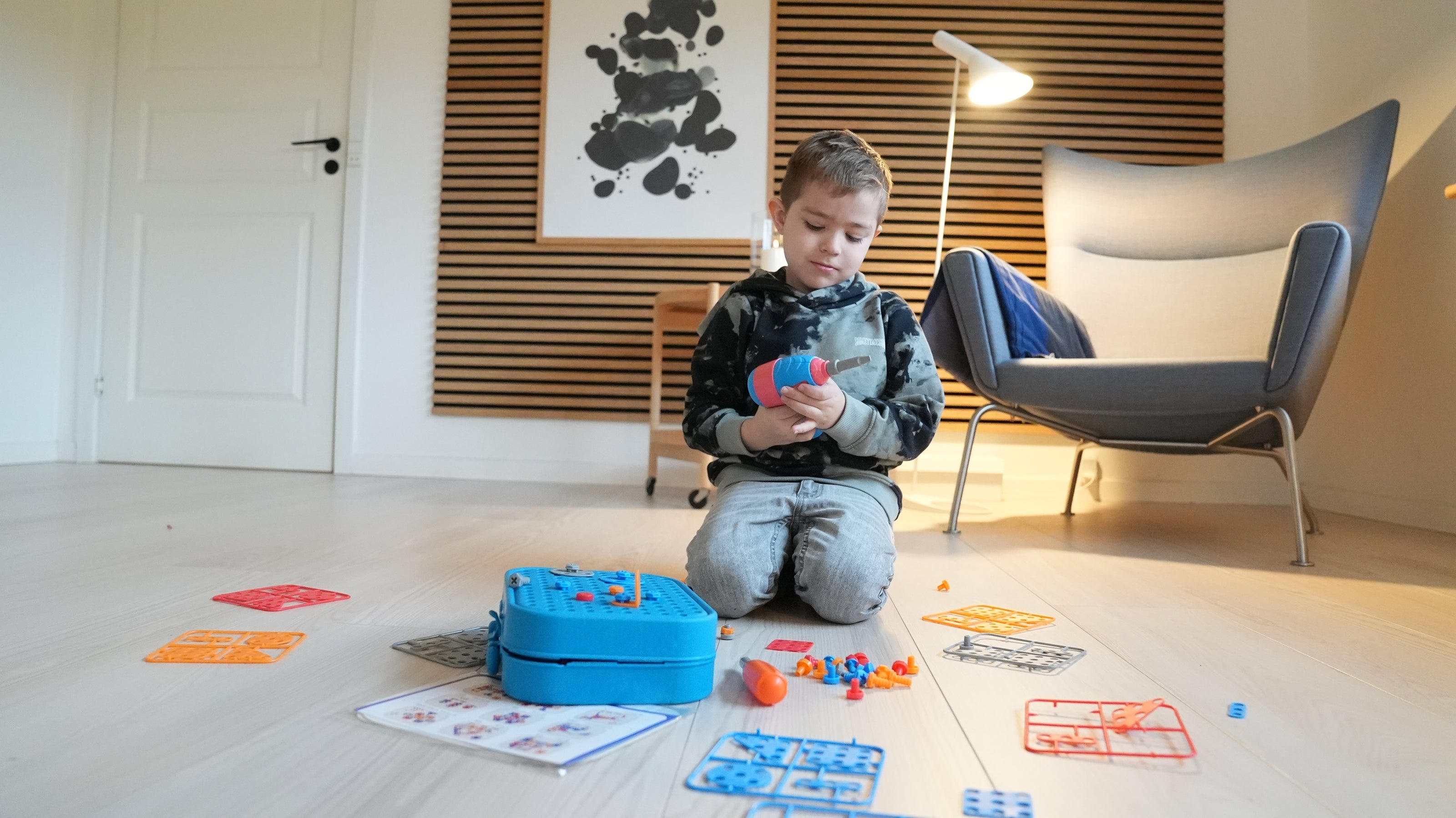 Nej, skruemaskinen larmer ikke som en rigtig boremaskine. Den er designet specielt til børn og laver kun en mild, børnevenlig lyd, så legen føles realistisk - uden at være generende for hverken børn eller voksne i hjemmet